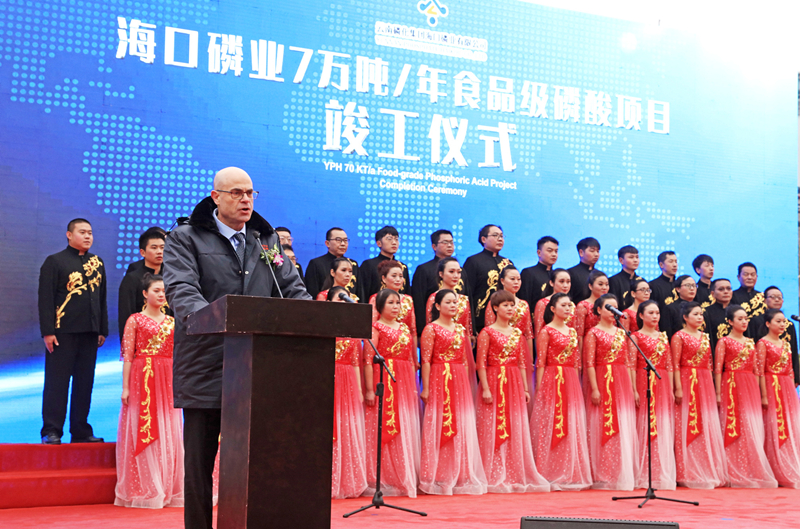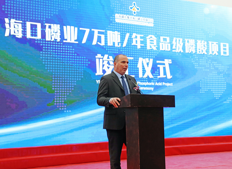 竣工仪式上,海口磷业总经理纳达夫·特纳(Nadav Turner)致欢迎辞。他表示,7万吨/年食品级磷酸是海口磷业成立以来第一个新建项目,符合国家产业政策和行业发展方向,被列为云南省“四个一百”重点项目,是公司实现转型升级的重要举措,项目的建成投产为公司健康可持续发展奠定了坚实的基础。