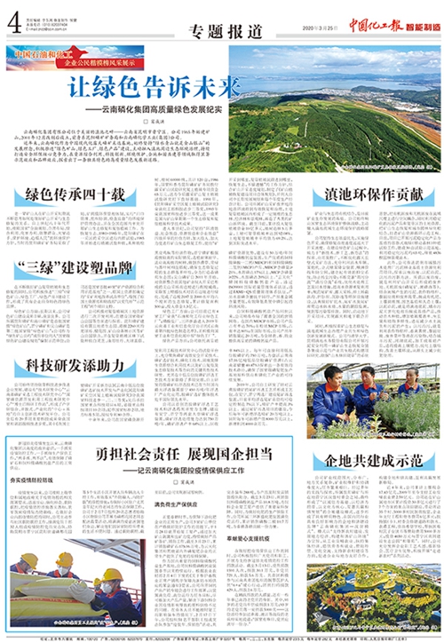 3月25日,中国化工报智能制造周刊在4版全版专题刊载公司所属磷化集团绿色发展历程。此次专题报道是对荣获 “2019年度中国石油和化工行业企业公民楷模·最具社会责任企业”进行的连续报道。