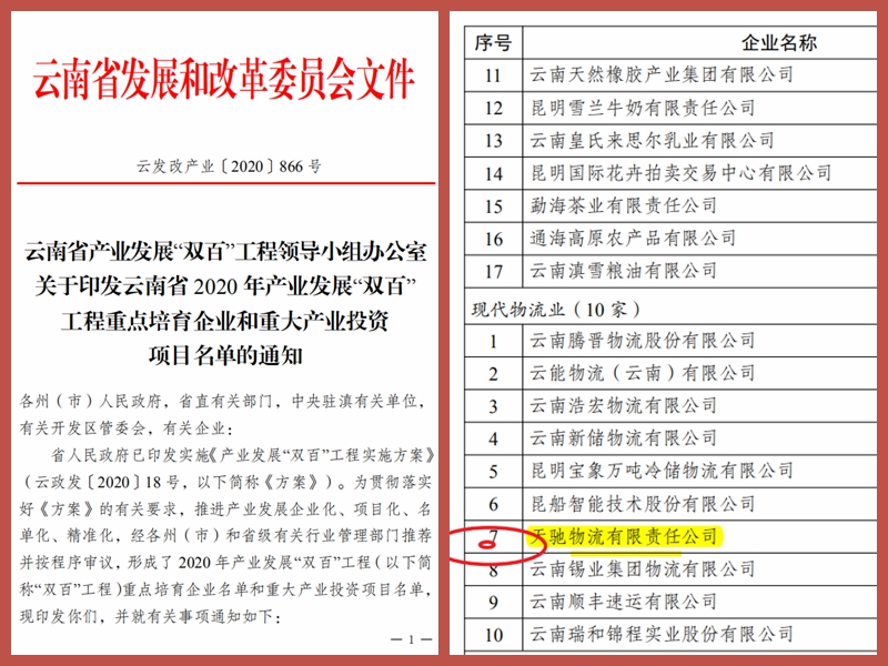 按照高质量发展的要求,经过对申报“双百”工程企业规模和增速基础、质量和效益等指标的严格遴选,最终确定天驰物流等10家企业作为云南省现代物流业重点培育企业,省委、省政府将采取加大信贷投入、加大财政资金扶持力度、设立“双百”工程产业基金等10项措施对入选企业进行重点培育。(文/师晓青 图/夏应江 编辑/何斌)