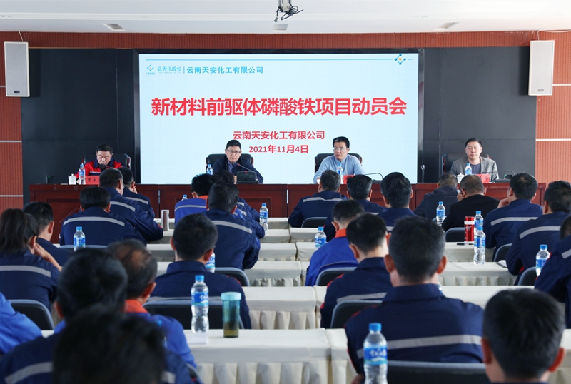 11月4日,公司在天安化工召开新材料前驱体磷酸铁项目动员会,公司党委书记、董事长段文瀚到会做动员讲话,公司副总经理师永林、相关部门负责人及天安化工领导班子成员、助理及以上中层管理人员、项目指挥部成员100余人参加了会议。会议由项目副指挥长、天安化工总经理曾家其主持。