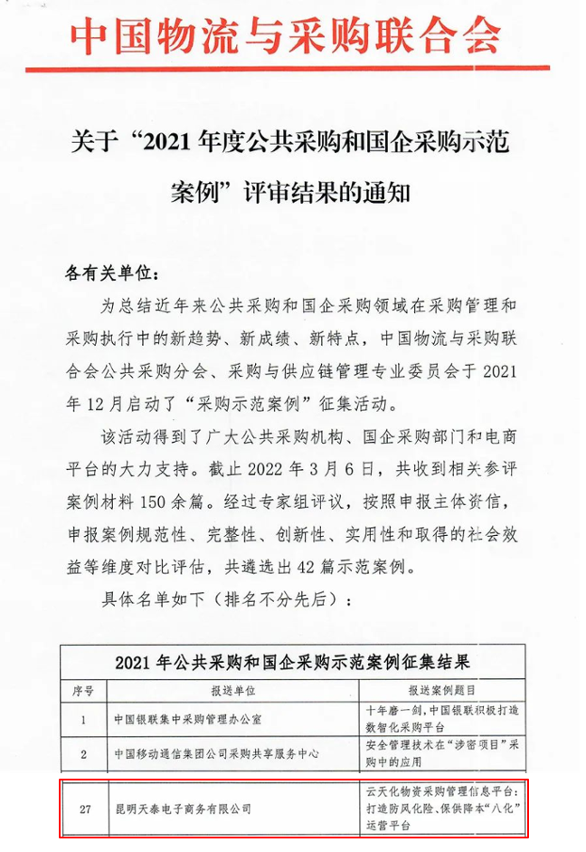 2022年3月31日,中国物流与采购联合会发布2021年度公共采购和国企采购示范案例评审结果,公司旗下昆明天泰电子商务有限公司“云天化物资采购管理信息平台”申报案例在全国150余项案例成功入选,为云南省唯一入选案例。