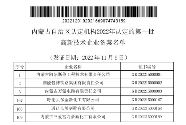 12月1日,全国高新技术企业认定管理工作领导小组办公室,对内蒙古自治区认定机构2022年认定的第一批高新技术企业备案名单予以公告。公司旗下金新化工正式迈入国家高新技术企业行列。