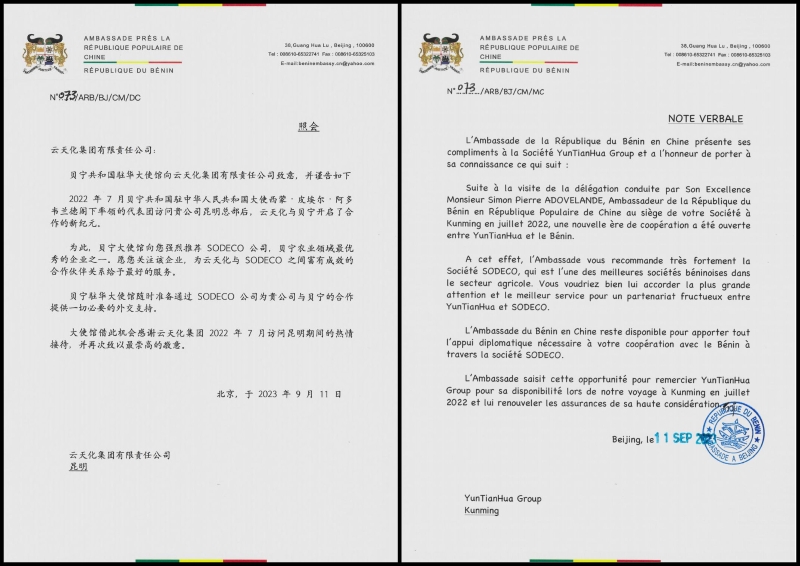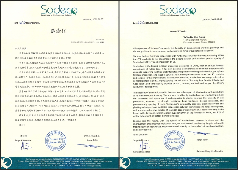9月8日,云天化收到贝宁SODECO公司的感谢信,信中,贝宁SODECO公司及其全体员工对云天化向他们提供的产品、服务和科学种植技术表示了诚挚的感谢,表达了与云天化携手并进,促进中、非企业合作交流的良好愿望。9月11日,云天化收到贝宁共和国驻华大使馆发来的照会,对2022年贝宁共和国驻华大使西蒙·皮埃尔·阿多维兰德到访云天化给予的热情接待表示感谢,表示愿意为云天化与贝宁农业领域最好的企业——SODECO公司的合作给予最好的服务。