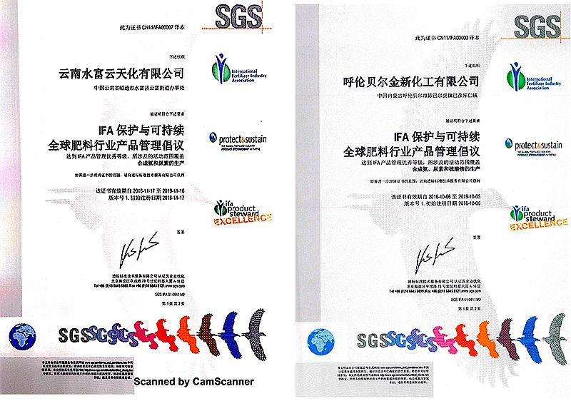 日前,公司旗下水富云天化、天安化工、金新化工、青海云天化、三环中化、红磷分公司、云峰分公司7家企业,通过IFA保护与可持续产品管理认证并取得证书,成为国内首批通过IFA保护与可持续产品管理认证的化肥生产企业。