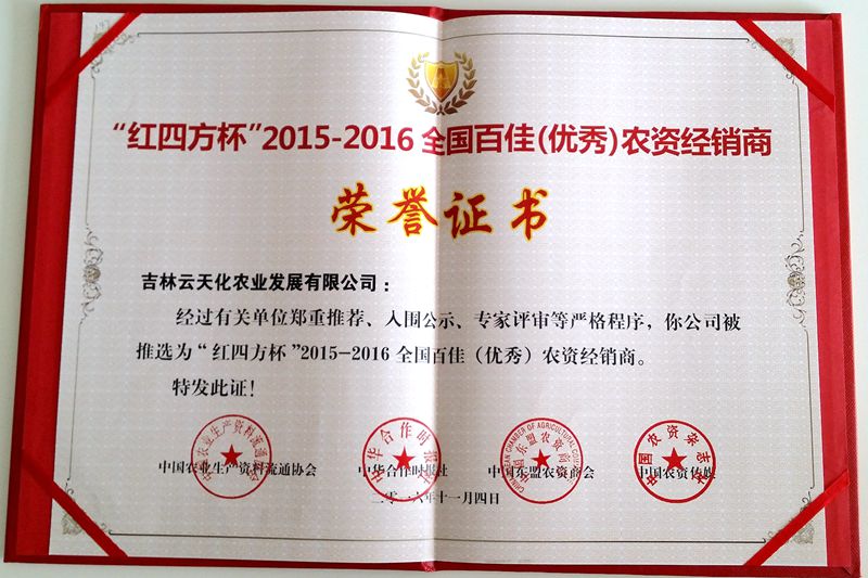 11月4日,在由中华合作时报社、中国农资流通协会、中国农资传媒、中盐红四方共同举办的“红四方杯”2015-2016全国百佳(优秀)农资经销颁奖典礼上,公司旗下吉林云天化获全国百佳(优秀)农资经销商殊荣。