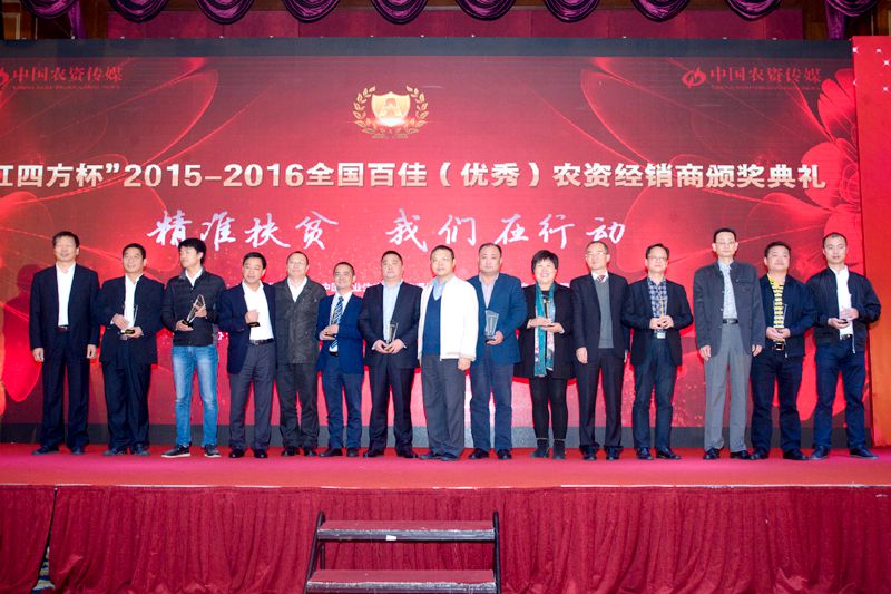 11月4日,2015-2016全国百佳(优秀)农资经销商颁奖典礼在南京举行,来自全国的化肥生产、流通龙头企业和800余名优秀经销商代表参加颁奖典礼。颁奖典礼上,公司荣获农资行业“精准扶贫十佳榜样”称号,颁奖词为:“扶危担己任,云露解民情;育贤延康阜,授业济升平。”