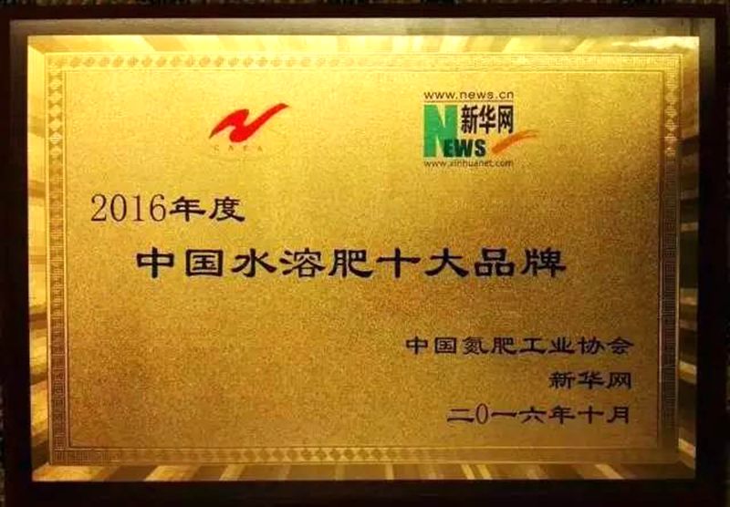 10月16日,在第四届中国国际水溶肥发展论坛上,公司荣获中国水溶肥十大品牌、最佳合作伙伴奖、诚信水溶肥企业三个奖项。